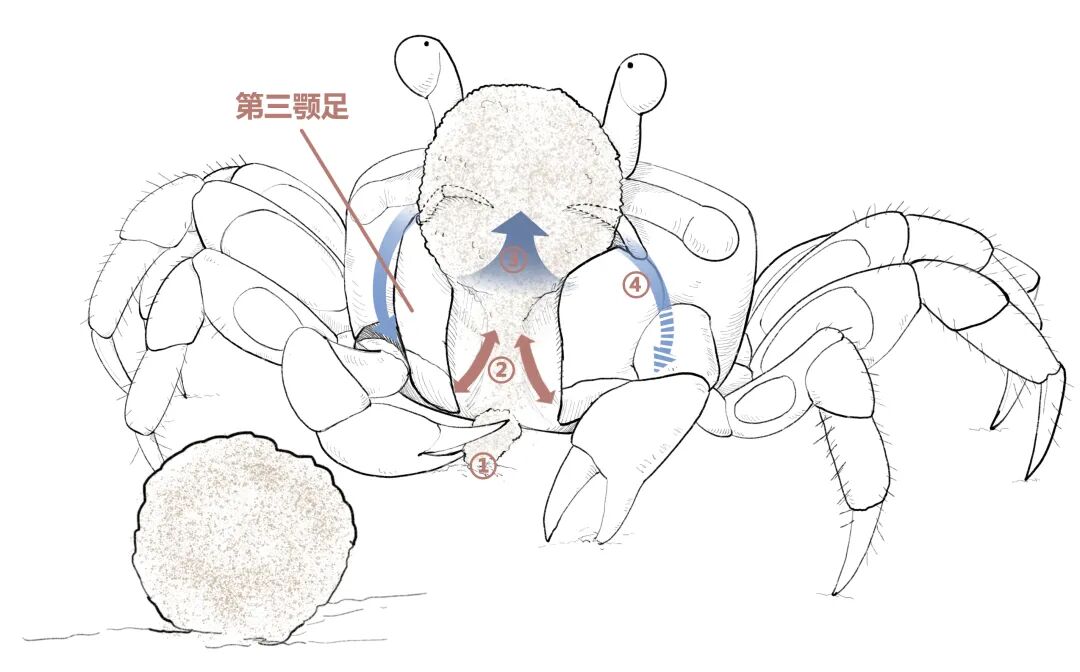吹沙蟹滤食过程图,图中的①②③④分别对应文中相应的文字。绘图:郑秋旸