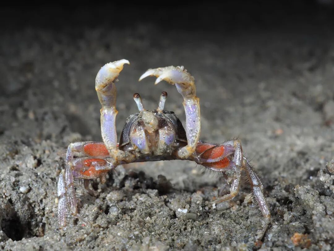 一只股窗蟹正吐着沙球,被端着相机的我,吓得“举起手来”。它腿上红色的卵形区域,正是它呼吸的“窗口”。