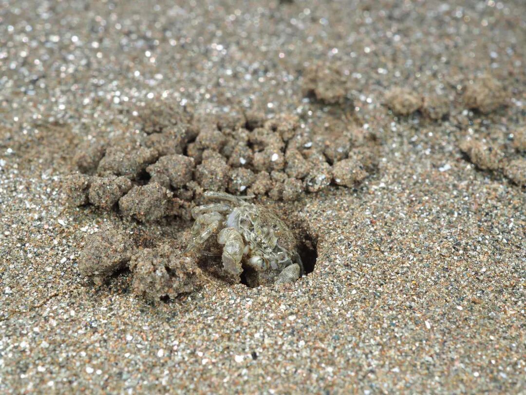 在洞口等上三两分钟,这些“艺术家”就会主动现身——一只花生仁大小的螃蟹,从沙洞中探出半个身子。