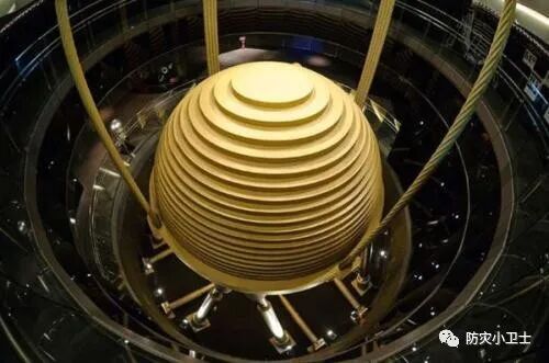 风阻尼器一般由质量块(巨型钢球)、吊索、常规阻尼器、限位阻尼器等组成,在强风时降低加速度的响应,利用左右摆动来降低大楼晃动的幅度。