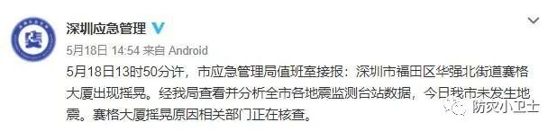 据@深圳应急管理消息,5月18日13时50分许,市应急管理局值班室接报:深圳市福田区华强北街道赛格大厦出现摇晃。经我局查看并分析全市各地震监测台站数据,今日我市未发生地震。