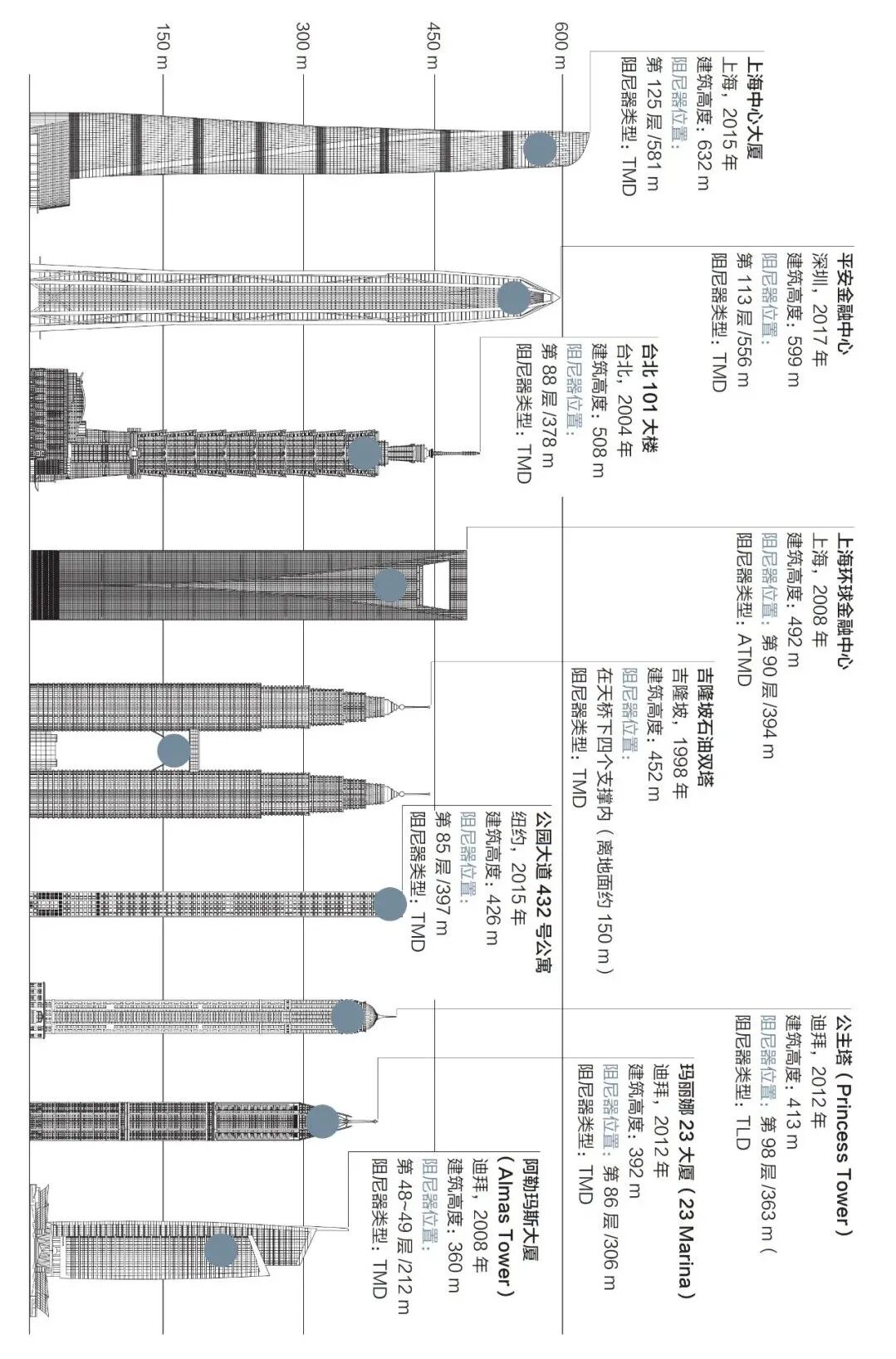 上海中心大厦的阻尼器以及阻尼器外壳顶部的抽象雕塑被巧妙地安置在一个特殊的公共“空中空间”内。 全球最高的20 座建筑中,只有30%装有阻尼器。 台北101 大楼的球形摆式阻尼器对公众开放,他们还设计了名叫“阻尼宝贝(Damper Baby)” 的公仔纪念品。 2009 年,东京新宿中心大厦(Shinjuku Center Tower)(1979 年建成) 进行了翻新,安装了288 个分布式油料阻尼器,这使其在2011 年东日本大地震中的晃动位移减少了20%。 纽约市西57 街111 大厦(111 West 57th Street) 的阻尼器重726 t,比3.5 个自由女神像还沉。 除了阻尼器,建筑师们用了什么方法来抵消风所产生的影响呢?