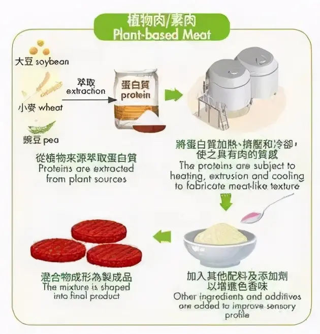 更直白的说,植物肉就是用大豆蛋白等做成的产品,部分可能会用豌豆蛋白或者小麦蛋白等等。看到这里,可能有人还是不太明白,再直白点儿说,我们吃的豆类,豆腐啊、豆浆啊等等,都是大豆蛋白做成的。