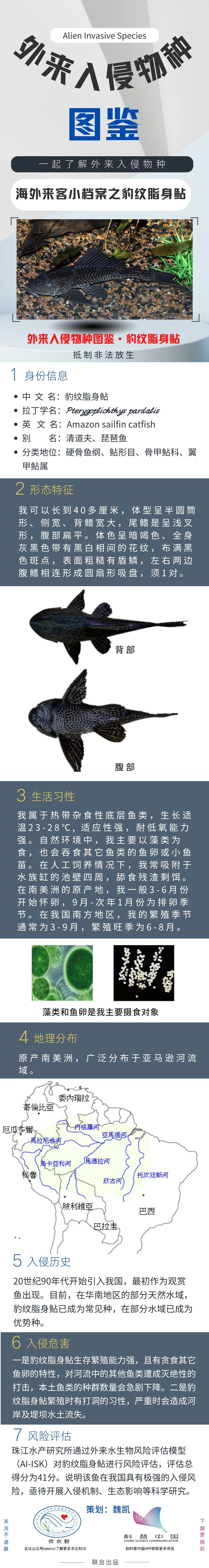 清道夫生存繁殖能力强,而且有贪食其它鱼卵的特性,对河流中的其他鱼类遭成灭绝性的打击,本土鱼类的种群数量会急剧下降。属于外来入侵物种,请勿违规放生。