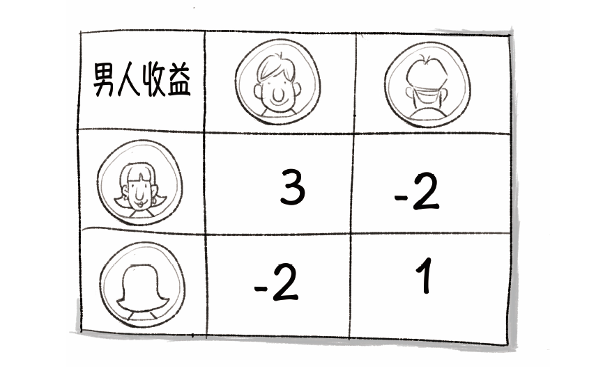 在这个游戏中,男人和女人并不是抛硬币,而是自己选择出硬币正面还是反面。显然,男人和女人都不可能一直出正面或者一直出反面,因为这样会被对手摸出规律。但是他们依然可以在多次游戏中将自己出正面的频率设定在某个值附近,从而获得统计意义上的收益,这就使得游戏从一个概率问题,变成了一个博弈问题。