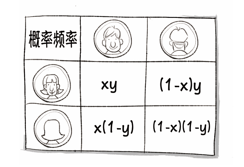 为了解决这个问题,我们假设男人出正面的频率为x,则男人出反面的概率为1-x;设女人出正面的频率为y,则女人出反面的频率为1-y。则各种情况出现的概率如表格所示。