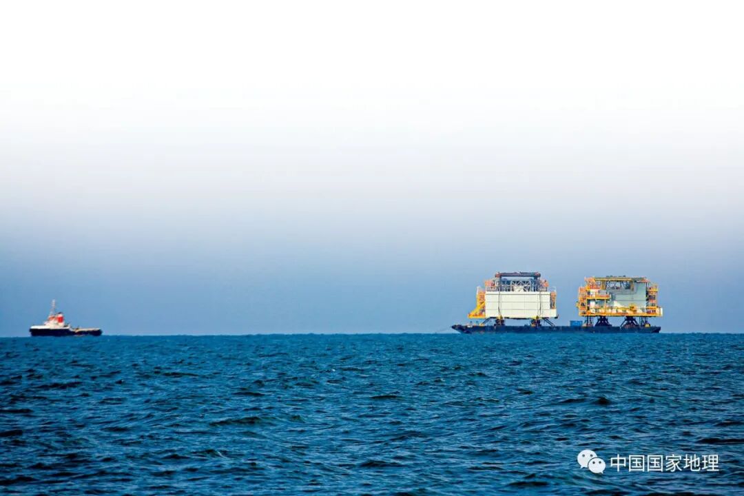 ◎ 2009年,在曾母暗沙附近,《中国国家地理》编辑部考察队遇上了一艘长达100多米的驳船,它被一条石油勘探船拖着,驳船上装载的是石油钻井平台的组装部件,它们都属于马来西亚。这一路上,遇到的一处处已建的、在建的、将要建造的马来西亚石油钻井平台,深深地触痛了每一个人的内心。有数据显示,截止到21世纪初,马来西亚已在南海打出近百口油气田,年产石油3000万吨,天然气近50亿立方米。(摄影/马宏杰,图自《中国国家地理》2010年10月)