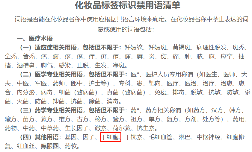 我国《化妆品标签标识禁用语清单》明确指出,化妆品严禁使用“干细胞”等词语。所以,如果商家宣称自己的护肤品含有干细胞,那就有理由怀疑他的生产途径是否正当了。来源丨百度文库在护肤品界,忽悠消费者的现象从未断绝。用干细胞来美容,名头虽大,但轻则赔钱,重则威胁健康与生命。劝君不要急剁手,健康生命无重来。