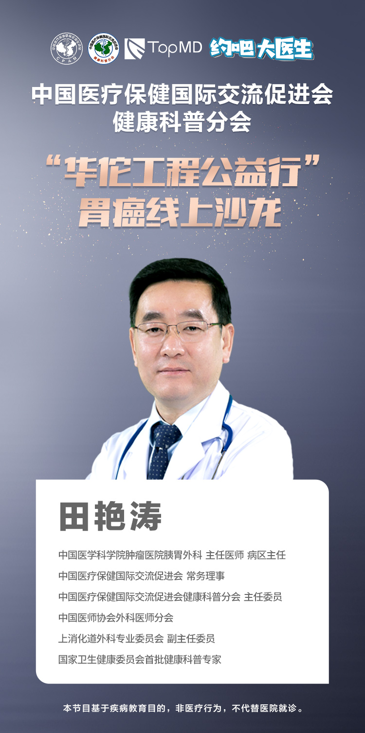 2021年5月10日,TopMD《约吧大医生》第79场直播探讨的内容是:探秘胃癌治疗的“新武器”。 本期TopMD《约吧大医生》之“华佗工程公益行”胃癌线上沙龙,我们邀请到中国医学科学院肿瘤医院胰胃外科主任医师田艳涛教授,中国医学科学院肿瘤医院胰胃外科副主任医师解亦斌教授做客直播间。