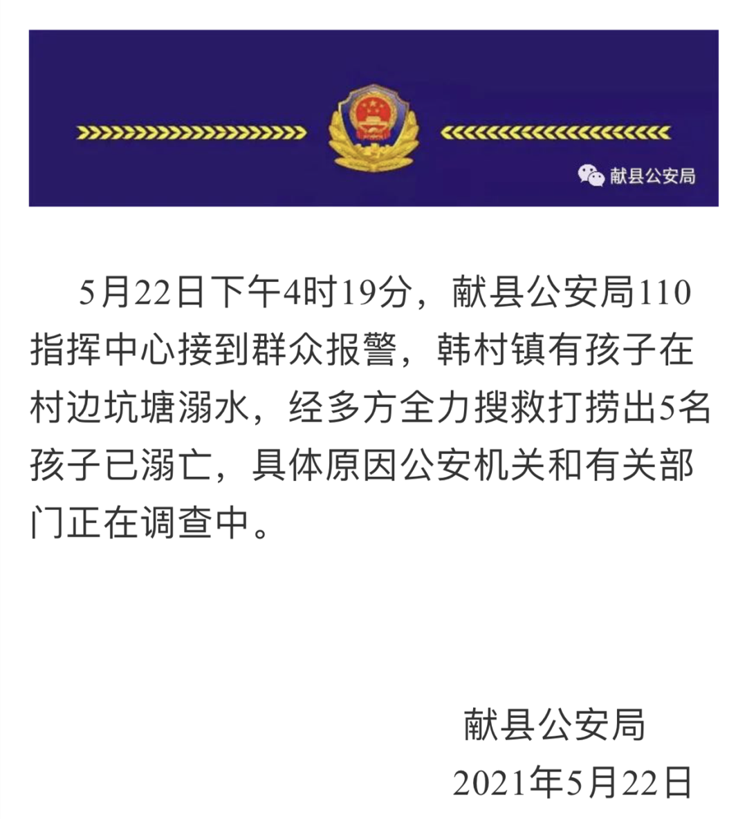 韩村镇有5名孩子在村边坑塘溺水身亡