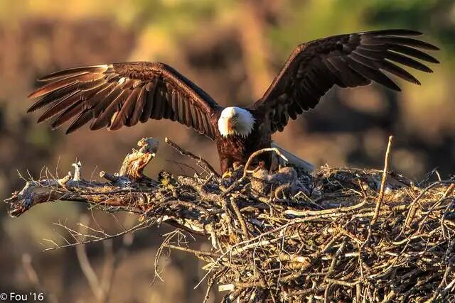 配对成功后,白头海雕夫妻就会选择一棵高大粗壮的大树,先用树枝搭好底层和外围的框架,中间再铺以厚厚的野草和其他动物的毛发。观察发现,白头海雕对于筑巢似乎有着令人难以置信的沉迷和偏执,只要一有空,夫妻俩都在琢磨怎样打造他们的起居室,有时候一根又长又粗的树枝会被他们叼着摆来弄去,数日而不知厌倦。
