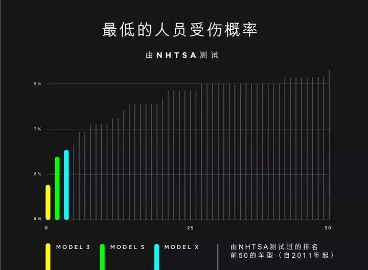在美国国家公路交通安全管理局(NHTSA)测试的车型中,在所有接受过测试的车型中,Model 3 的人员受伤概率是最低的。Model 3 在每个类别和子类别中获得全五星安全评级。