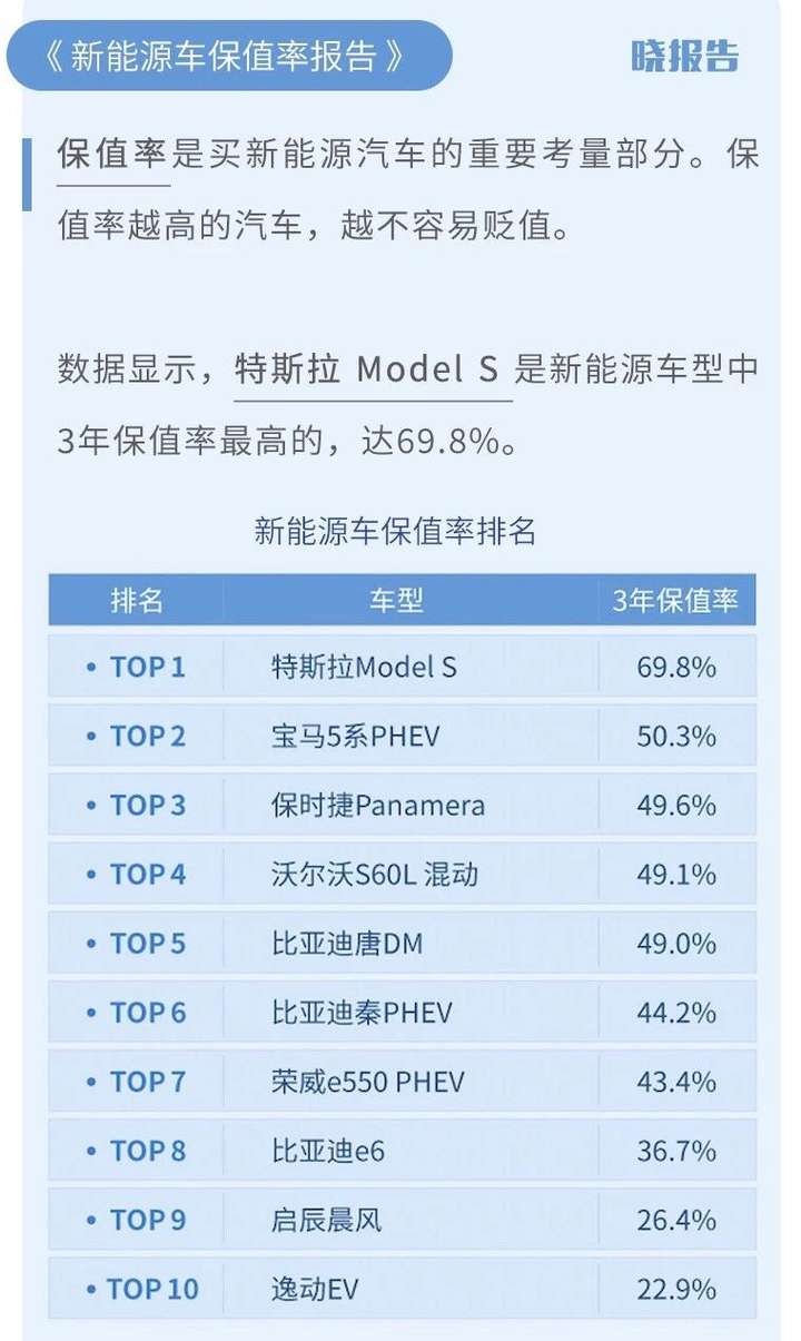 保值率越高的汽车,越不容易贬值。数据显示,特斯拉 medel s是新能源车中保值率最高的。