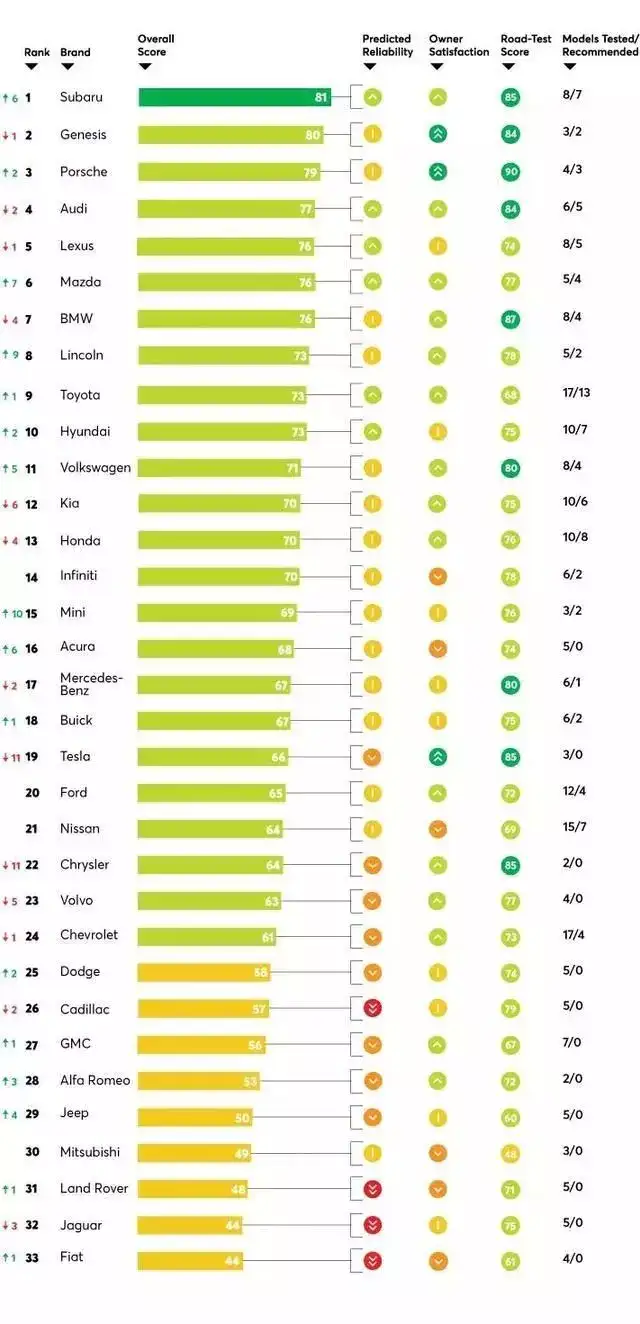 根据美国权威《消费者报告》(Consumer Report)公布的2019年度汽车品牌可靠性和车主满意度榜单。斯巴鲁击败捷恩斯荣登第一名,而克莱斯勒和特斯拉是跌幅最大的两个品牌,相比于往年两家排名都下跌了11位,克莱斯勒位居第22,而特斯拉排在了19位。