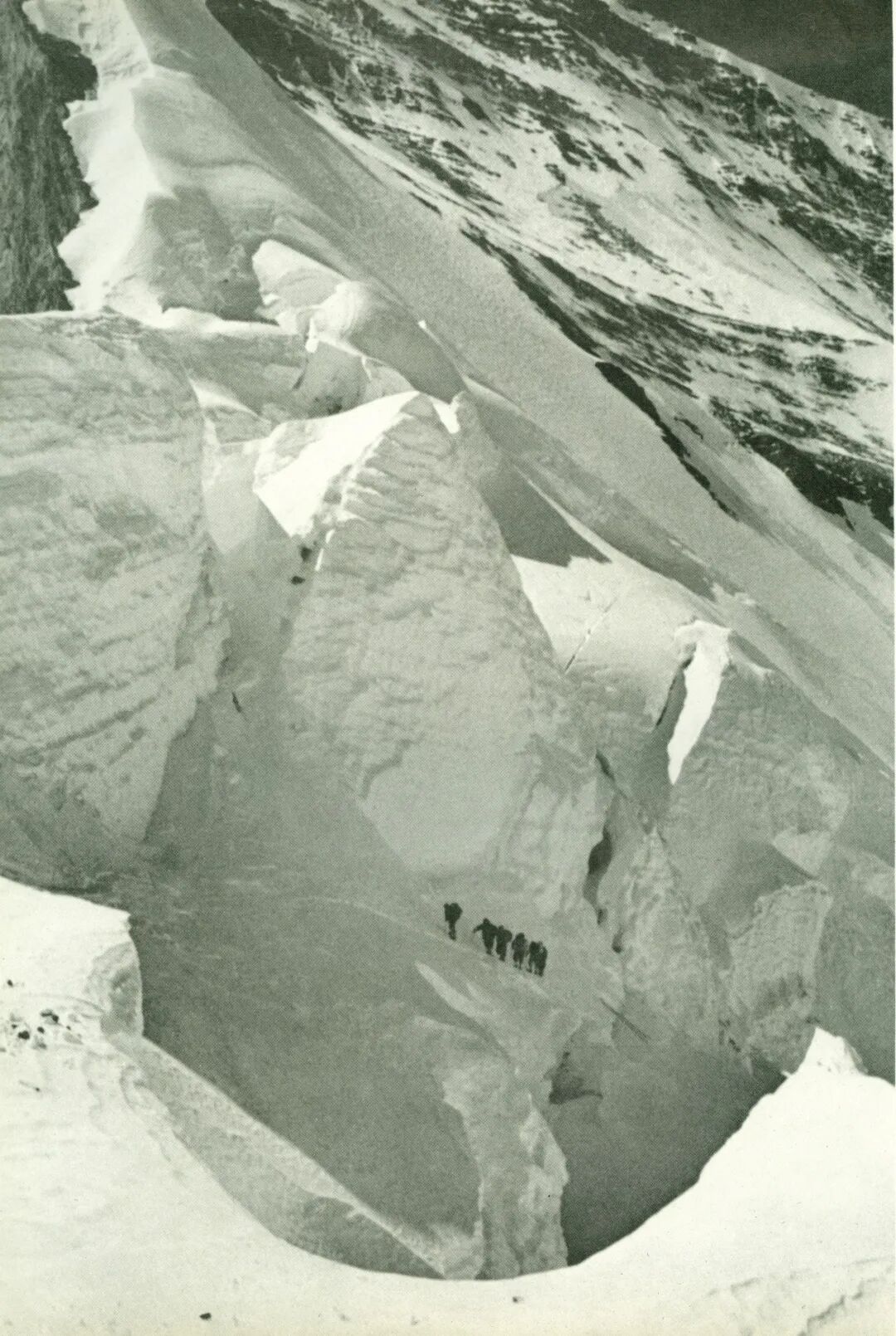 队伍行进在海拔6950米的冰裂缝边沿地带快要到达北坳顶端