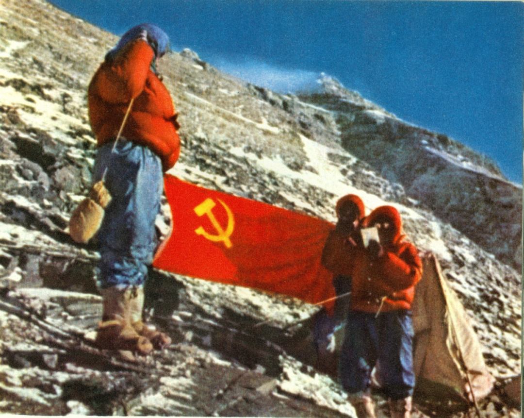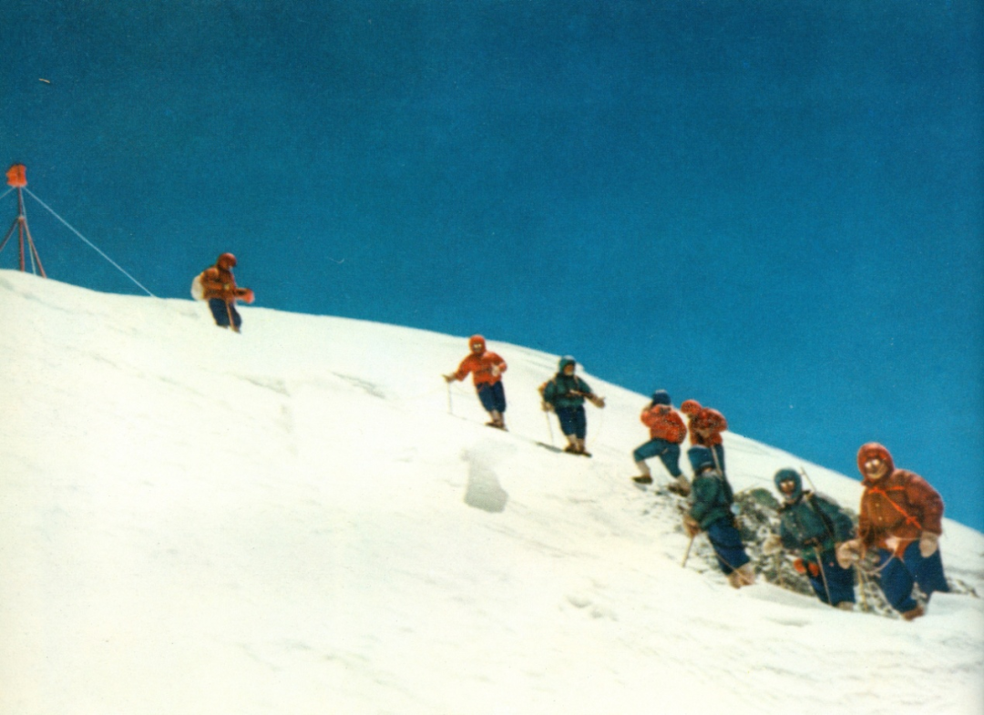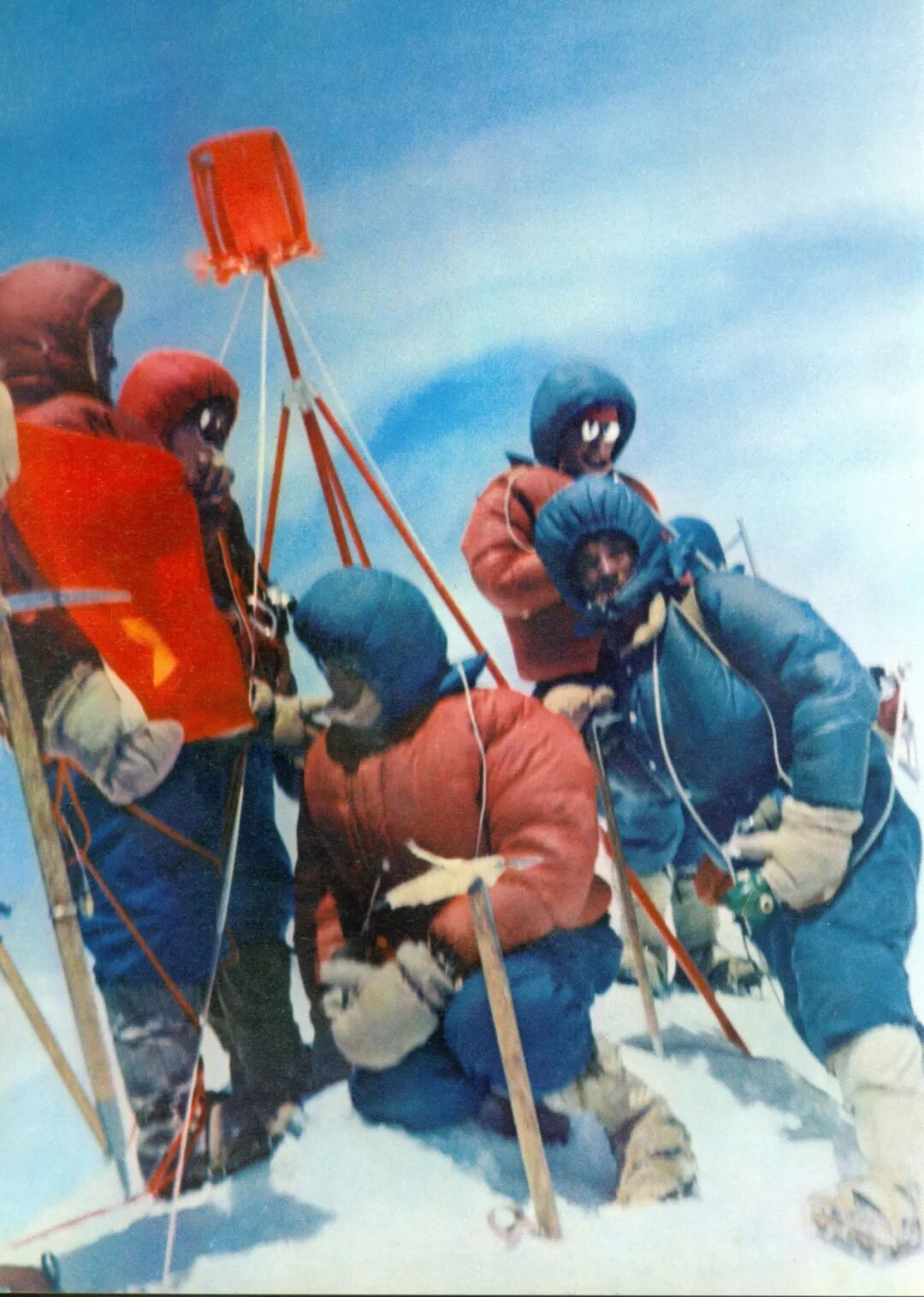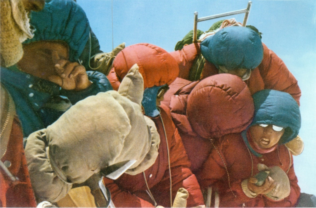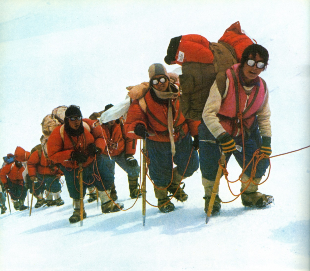 1975年5月27日,九名男女运动员胜利登顶珠峰,竖立觇标、展示国旗(图源:网络)