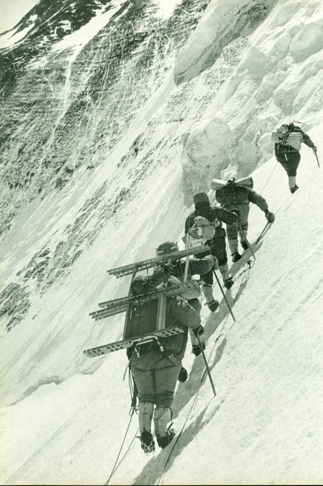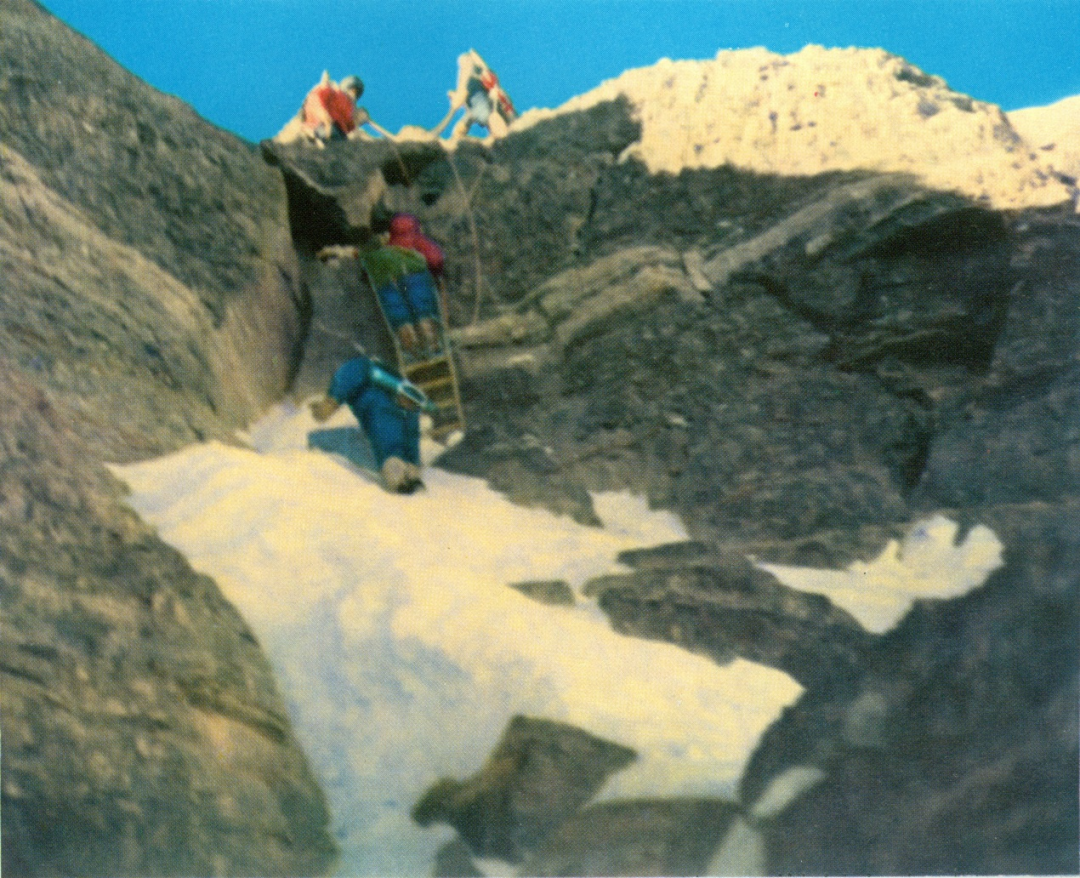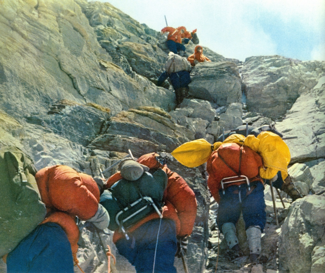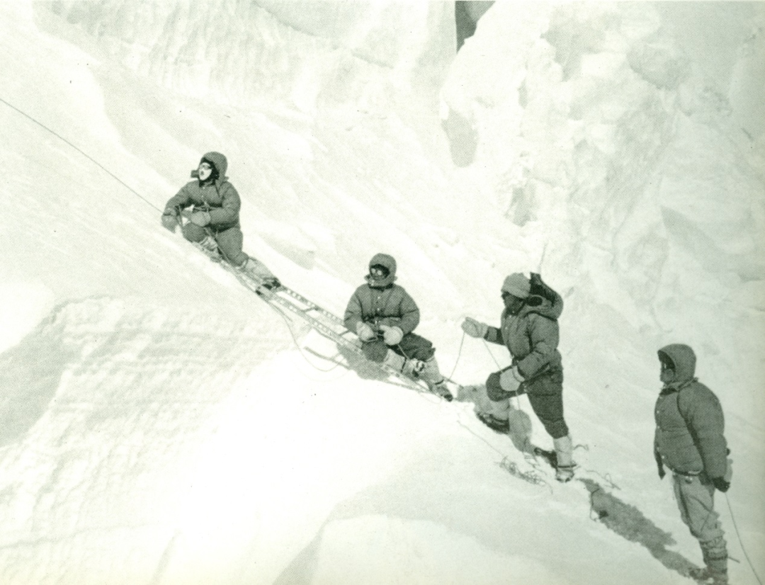 “第二台阶”相对高度约20米,平均坡度在六、七十度左右,顶端五米近于垂直。登山队把四节、每节长度为1.2米的铝合金梯子连接架设在第二台阶的陡壁处,大大降低了攀爬难度。队员们互相保护着,沿着金属梯奋力向上攀登。这些金属梯是由担负侦察修路任务的索南罗布、大平措、次仁多吉和贡嘎巴桑等四人在头天下午架设起来的。