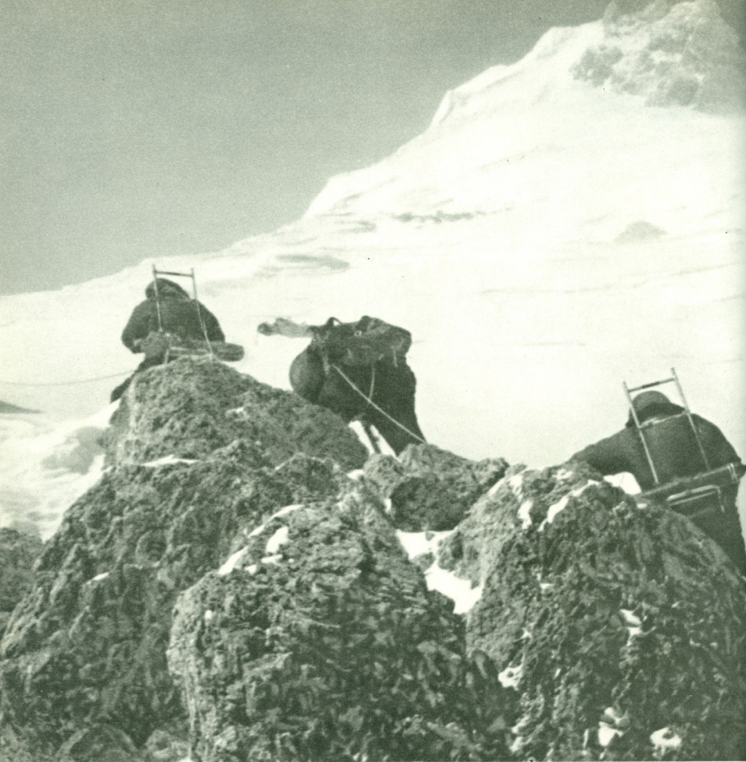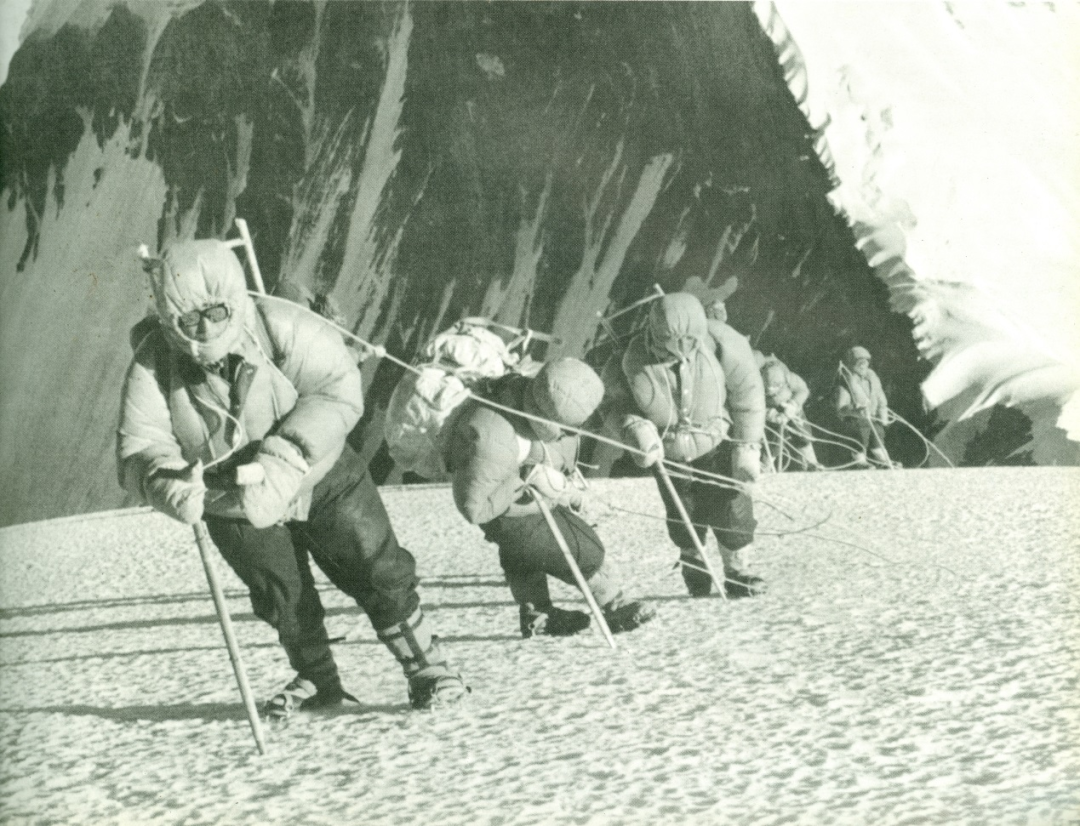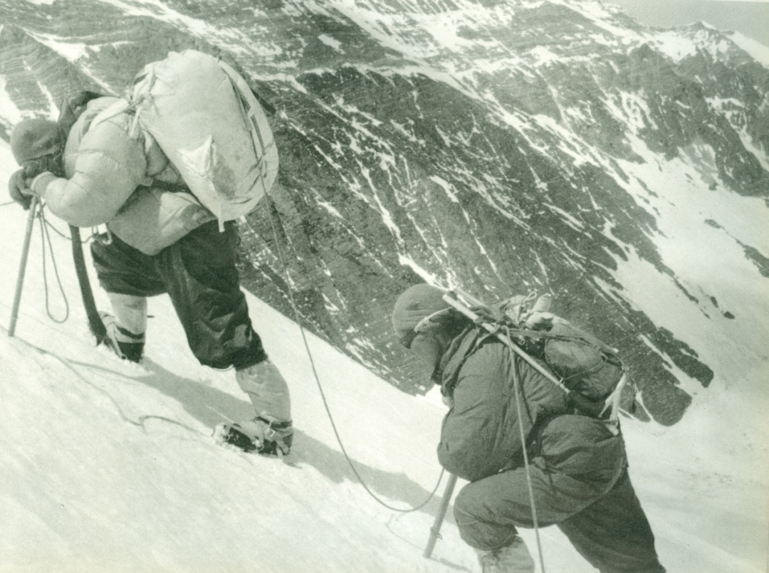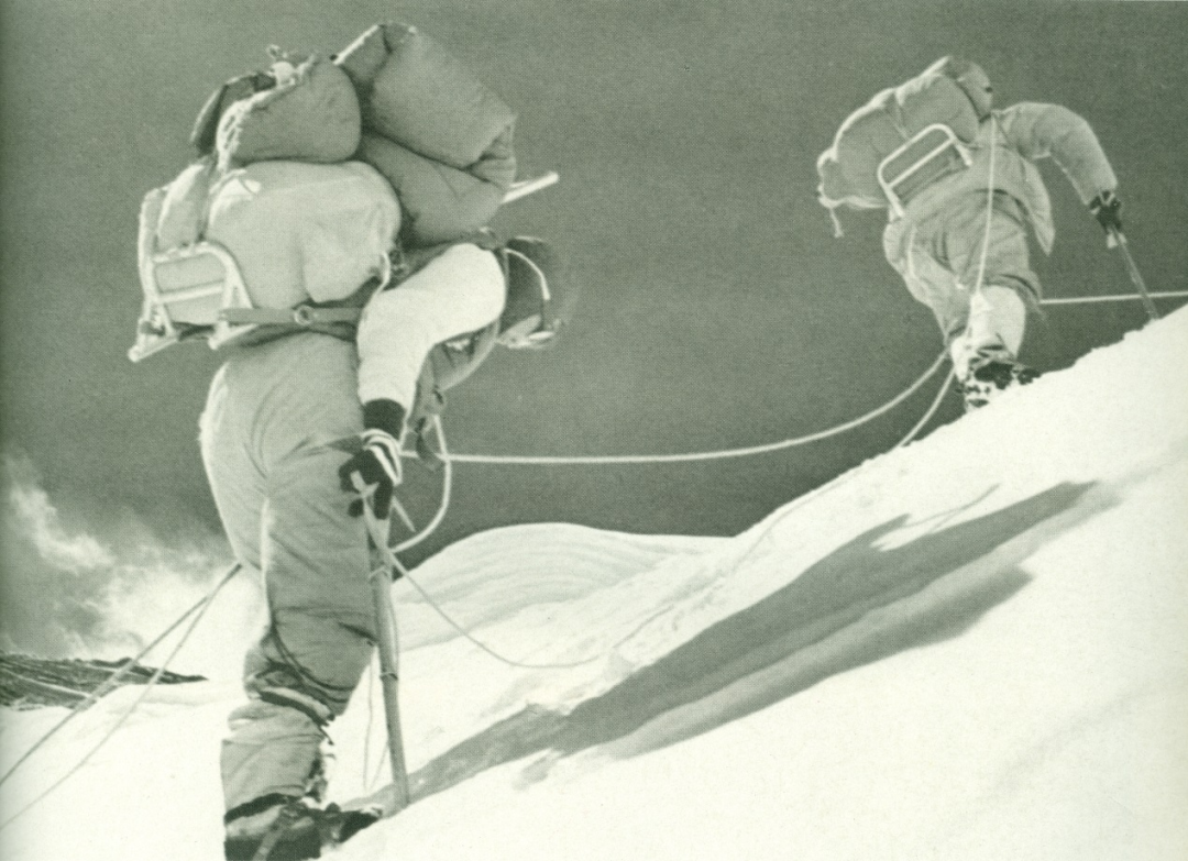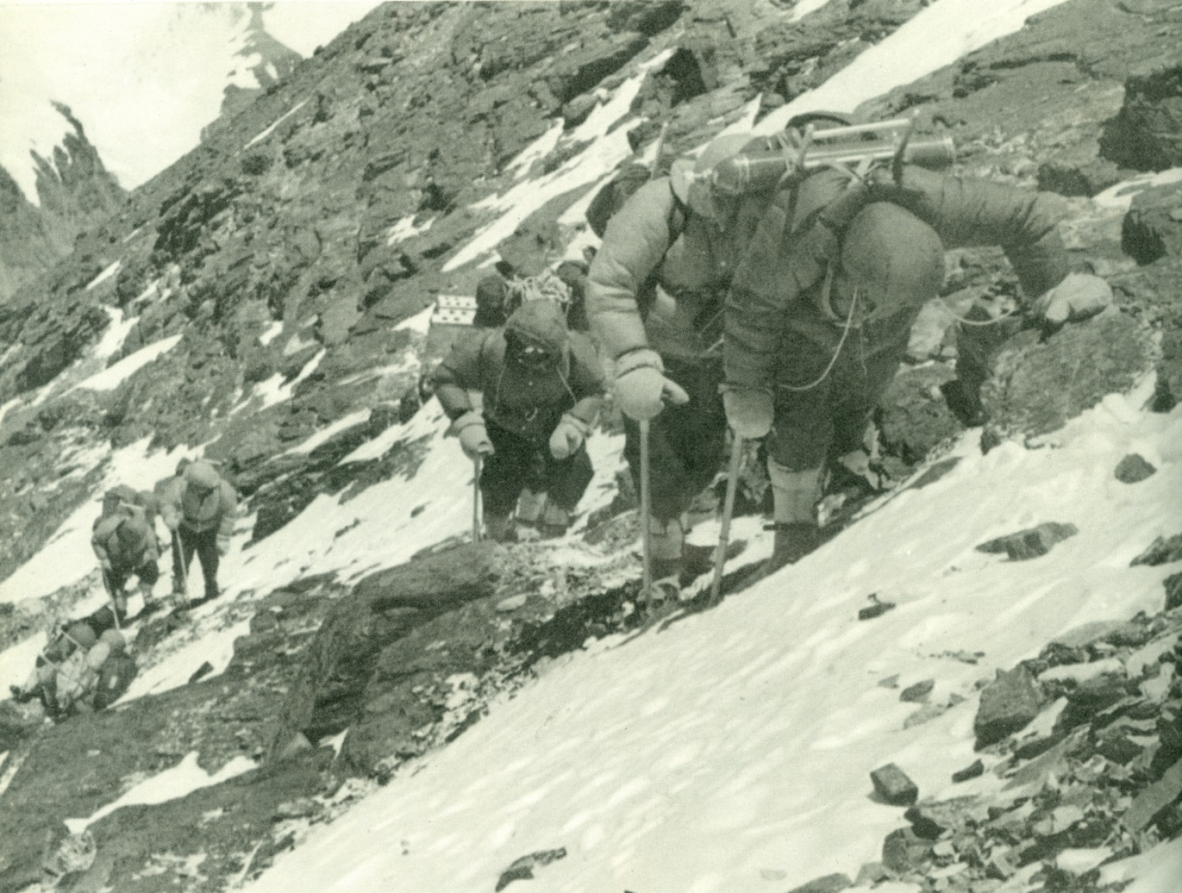 “第二台阶”相对高度约20米,平均坡度在六、七十度左右,顶端五米近于垂直。登山队把四节、每节长度为1.2米的铝合金梯子连接架设在第二台阶的陡壁处,大大降低了攀爬难度。队员们互相保护着,沿着金属梯奋力向上攀登。这些金属梯是由担负侦察修路任务的索南罗布、大平措、次仁多吉和贡嘎巴桑等四人在头天下午架设起来的。