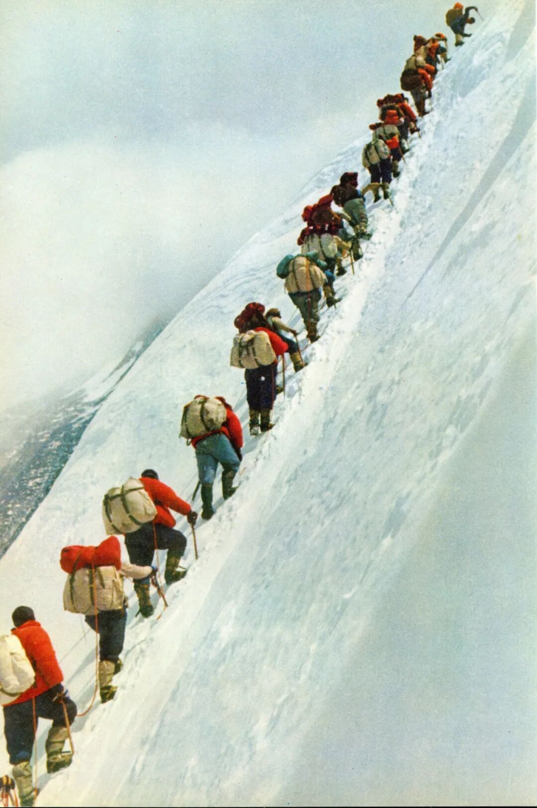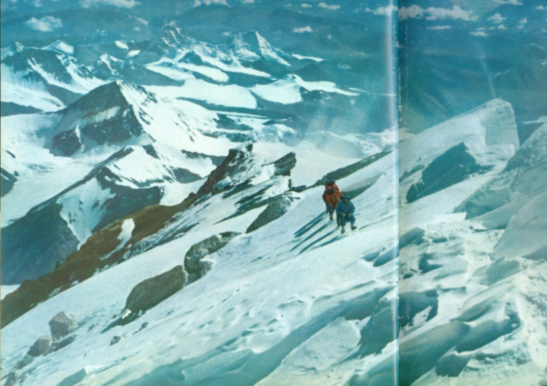 接着,突击队员们越过一段碎石斜坡,艰难地行走在坚硬的冰雪坡上。再经过一段黑色岩石斜坡,便走上了接近珠峰顶部的又一个冰雪坡。时间已是正午,数小时的攀登,队员们体力消耗极大。他们坐在冰雪坡上,略事休息,每人吸些氧气,便向顶峰发起了最后冲击。