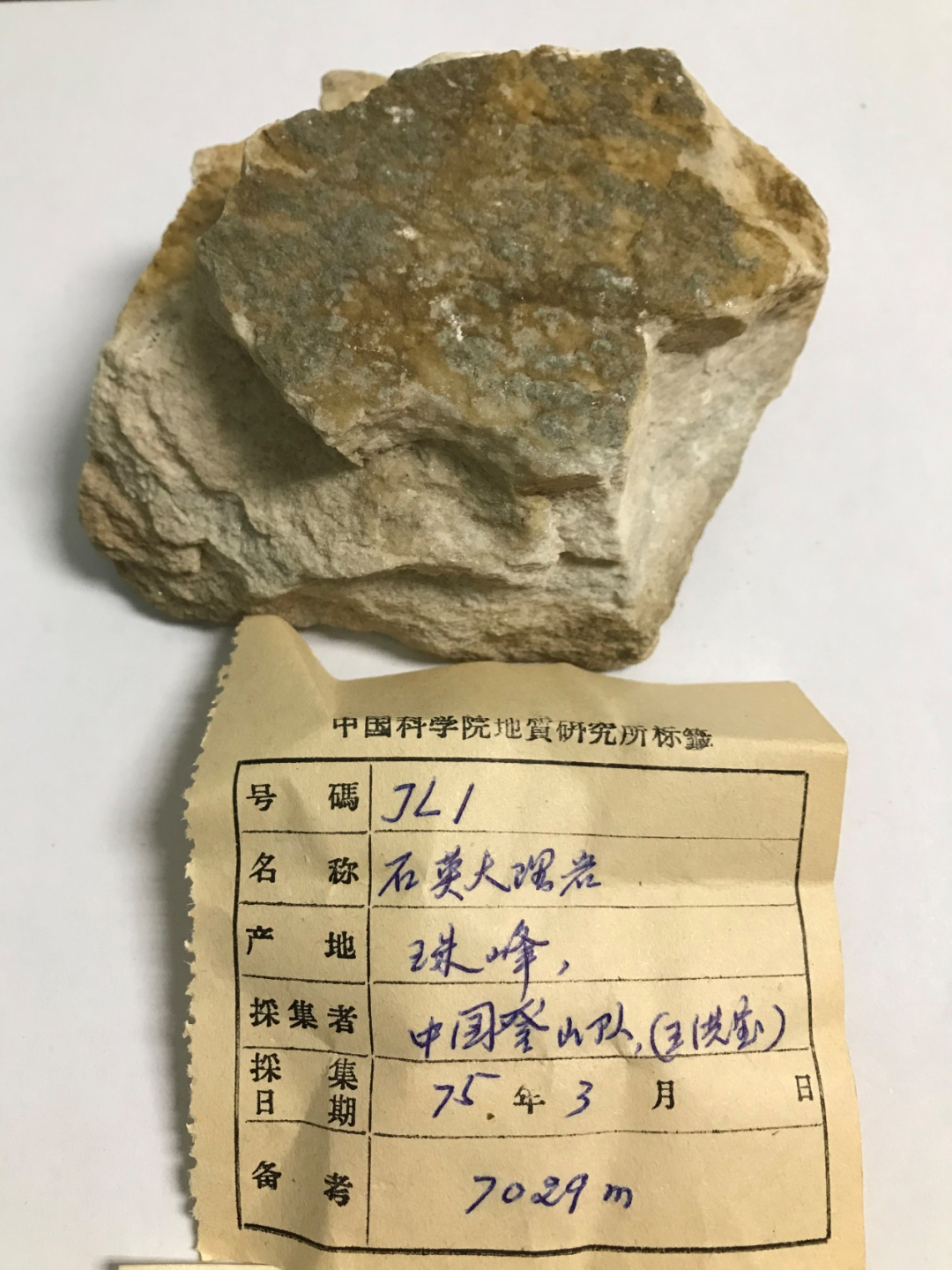 保存在中国科学院地质与地球物理研究所博物馆的珠峰顶峰结晶灰岩标本(采集人:中国登山队阿布钦,海拔高度:8840m)