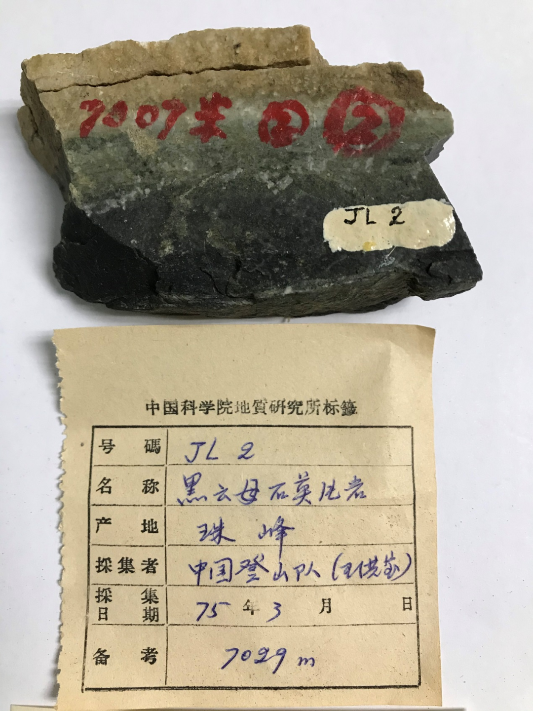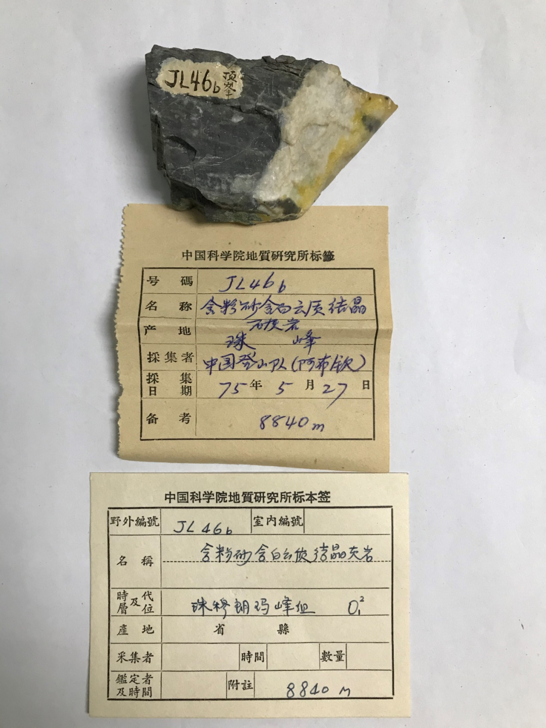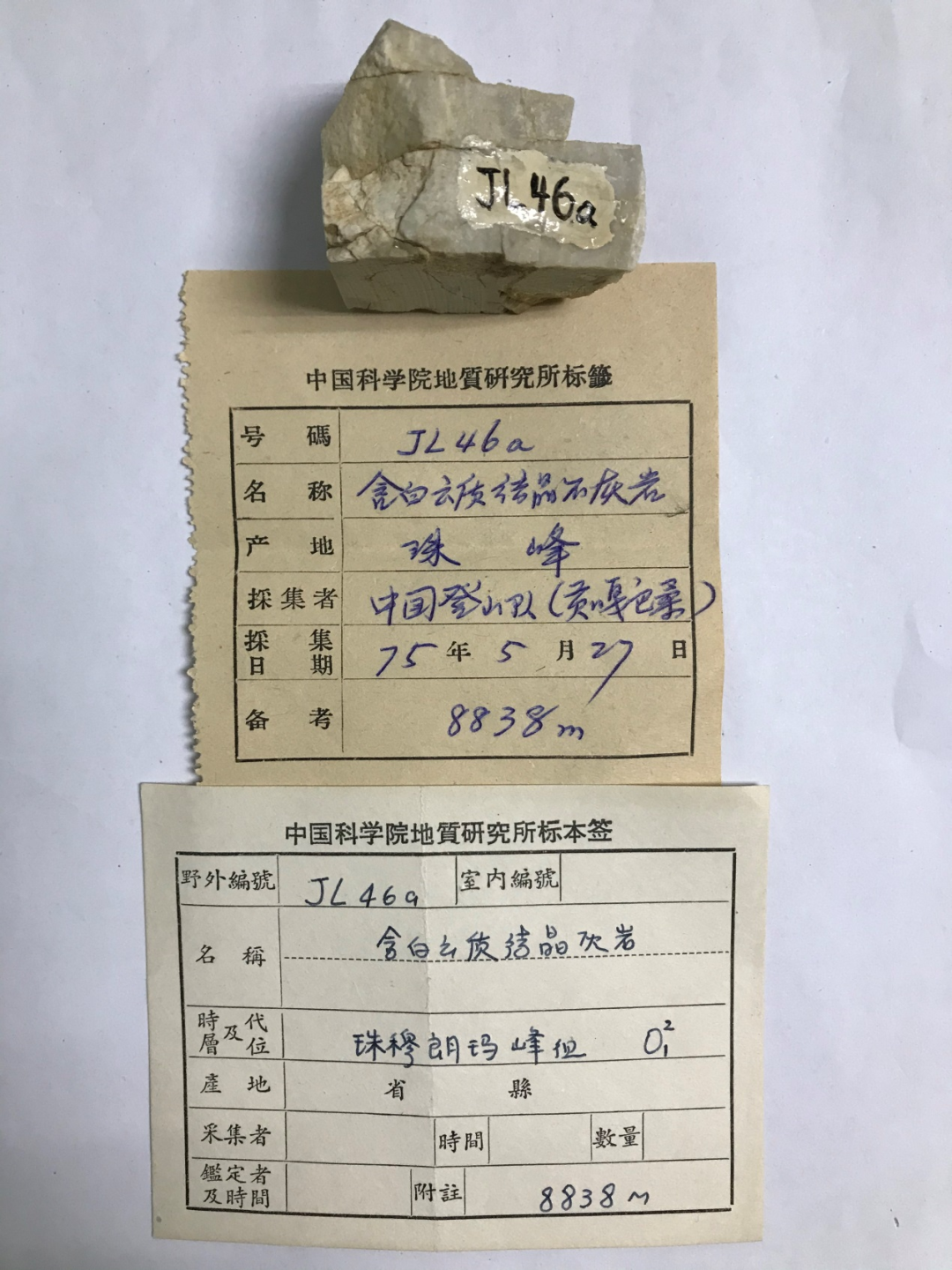 保存在中国科学院地质与地球物理研究所博物馆的珠峰岩石标本显示海拔8838米的含白云质结晶灰岩是贡嘎巴桑采集的