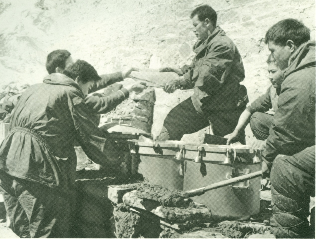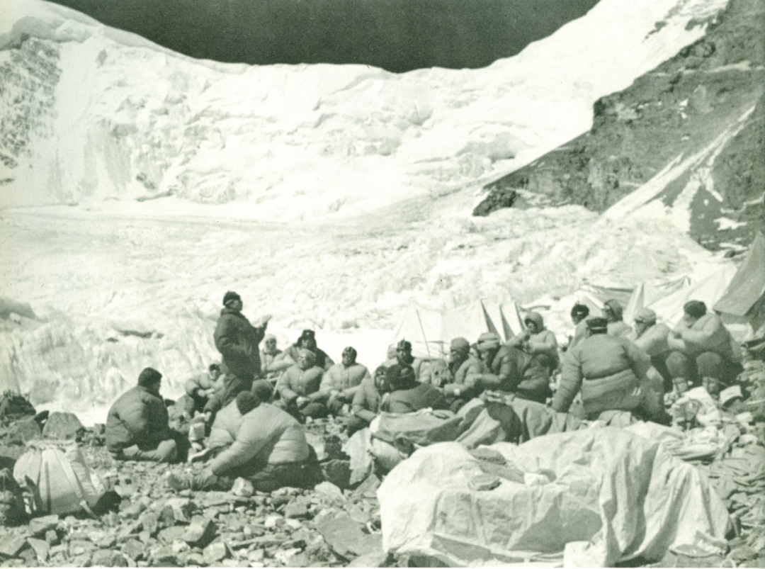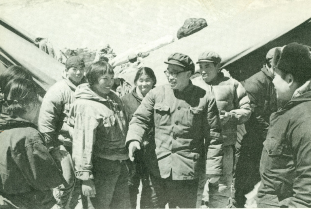 登山队党委书记、1960年首次从北坡登上珠峰的三名运动员之一的王富洲(右2)和运动员在6000米营地