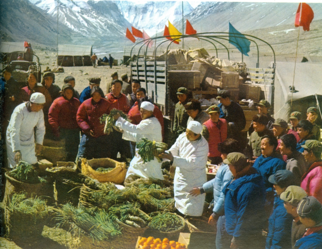 此时的珠峰大本营处于沉闷、忧伤的气氛中,对于这个春季是否还有登顶好天气出现,气象组心中没有把握,大本营也已经快要“弹尽粮绝”,登山队领导心中也没有把握。消息很快报告给了党中央,当时主持中央军委工作的叶剑英元帅立即派出两架军用飞机,从北京出发,满载当时北京最好的各种新鲜蔬菜和食品直飞西藏日喀则机场,再用卡车运送到珠峰大本营。