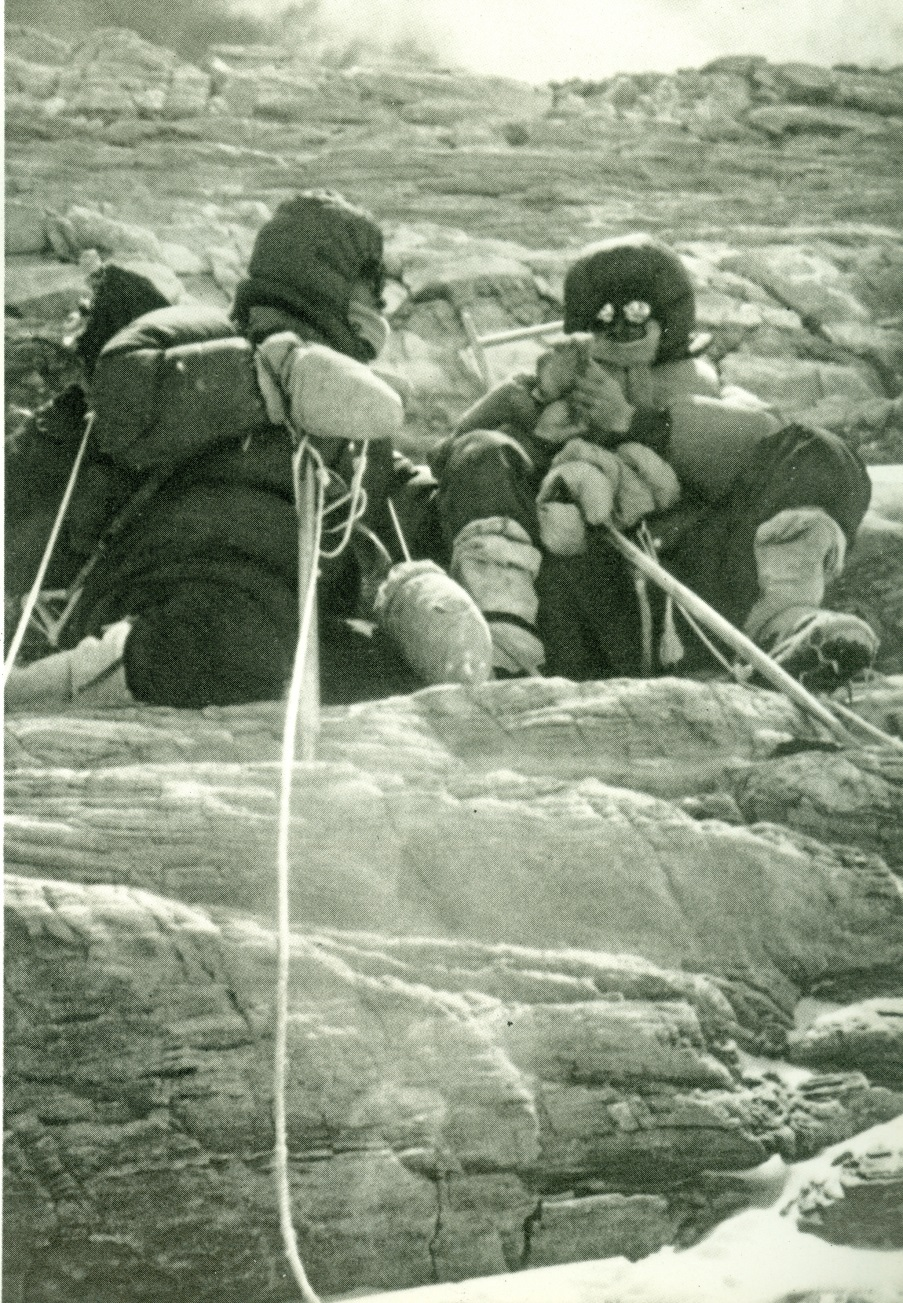 5月24日,风雪稍微转小,第一结组就不顾疲劳地冒着风雪前进了,于25日来到了8680米的突击营地。第二结组于25日也出发了,26日与第一结组会合。