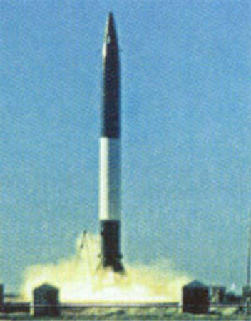 随着操作员准确而谨慎地掀动电钮,只听一声轰鸣,“东风二号”导弹拔地而起。它尾部喷吐着长长的火舌,扶摇而上,直刺蓝天。瞬间,它倾斜了身躯,按照预定的轨道,向荒漠飞去。