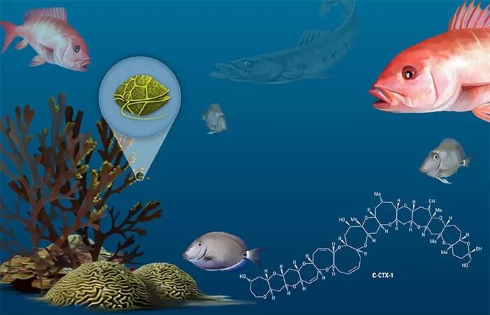 世界卫生组织介绍,超过400种珊瑚礁鱼类含有西加鱼毒素,其中包括超受欢迎的商业鱼种,如石斑鱼、海鲈鱼和红鲷。除了珊瑚礁鱼类,在珊瑚礁出没的螃蟹、龙虾、海胆和贝类也都有可能携带西加鱼毒素。