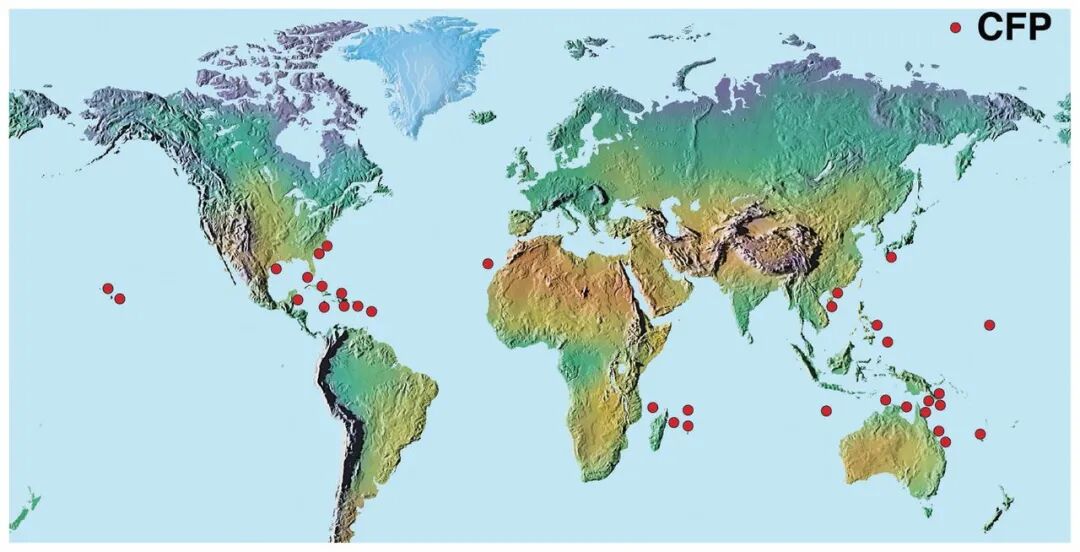 有西加鱼毒素中毒报道的地区(红点)。图片来源:the US National Office for Harmful Algal Blooms, Woods Hole Oceanographic Institution, Woods Hole, Mass.