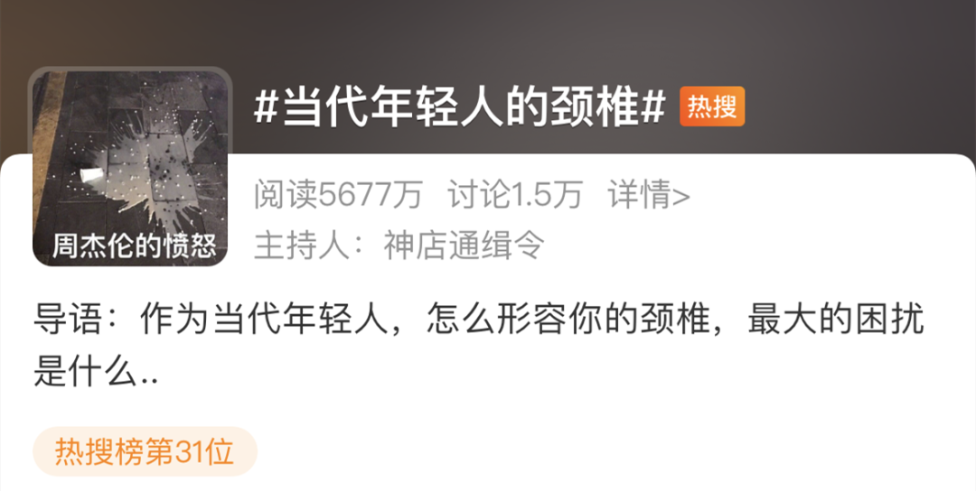 全天低头族、手机依赖症……总之,无论是996的日常搬砖还是好不容易放个假的深度宅,对我们脆弱的颈椎都是一种压力,时间一长,颈椎病就不请自来了。脖子疼的不是你一个人,#当代年轻人的颈椎#一跃成为热搜。