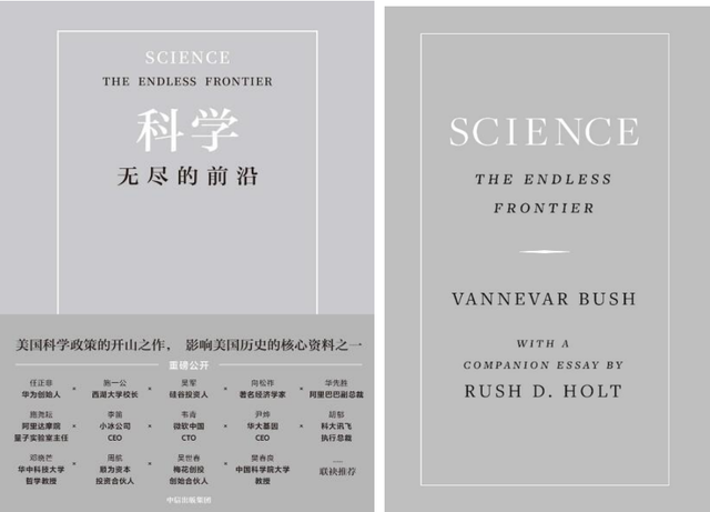 布什的回答就是《科学:无尽的前沿》(Science,The Endless Frontier)这篇著名的报告,“美国科学政策的开山之作,影响美国历史的核心资料之一。”自1945年出版以来,这本书已经再版了很多次,中译本也不止一个版本了。中信出版社今年出版的这本《科学:无尽的前沿》与普林斯顿大学出版社的新版原著Science, the Endless Frontier基本上是同时出版的,可能是商量好的吧。英文版除了布什当年的报告以外,还有美国科学促进会前首席执行官霍尔特(R. D. Holt)写的一篇文章,The Science Bargain,从75年以后的有利视角来评判布什这份报告的成败得失和当前美国面临的新挑战。中文版(崔传刚译)除了翻译这两篇文章以外,还在书的前面采用了22位名人的赞誉——14位来自国内(包括任正非和施一公),8位来自美国(比原著的13位少了5人,我猜可能是因为他们的感想没来得及赶上翻译为中文吧),在书的后面采用了中国10位名人的评论文章,最有名的当然还是华为公司的任正非。