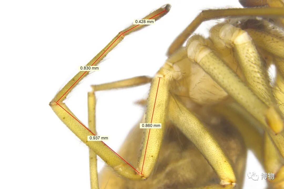 上面只是测量数据,还要“数毛”呢。所谓“数毛”,其实是数“刺”。蜘蛛的腿上有一些毛状的刺,这些刺可以协助控制猎物。有些蛛形学家认为,在某些类群里,刺的数量也是分类特征,于是数毛也成了分类的“必修课”。