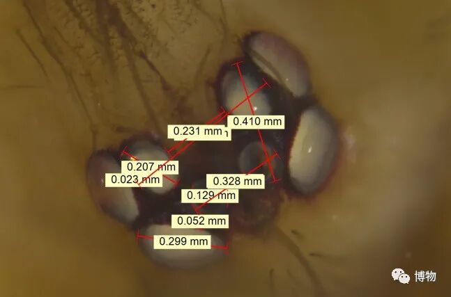 图中几个浅色的椭圆是蜘蛛的眼睛,我用显微镜拍摄照片,然后测量眼睛长宽、距离等数据。