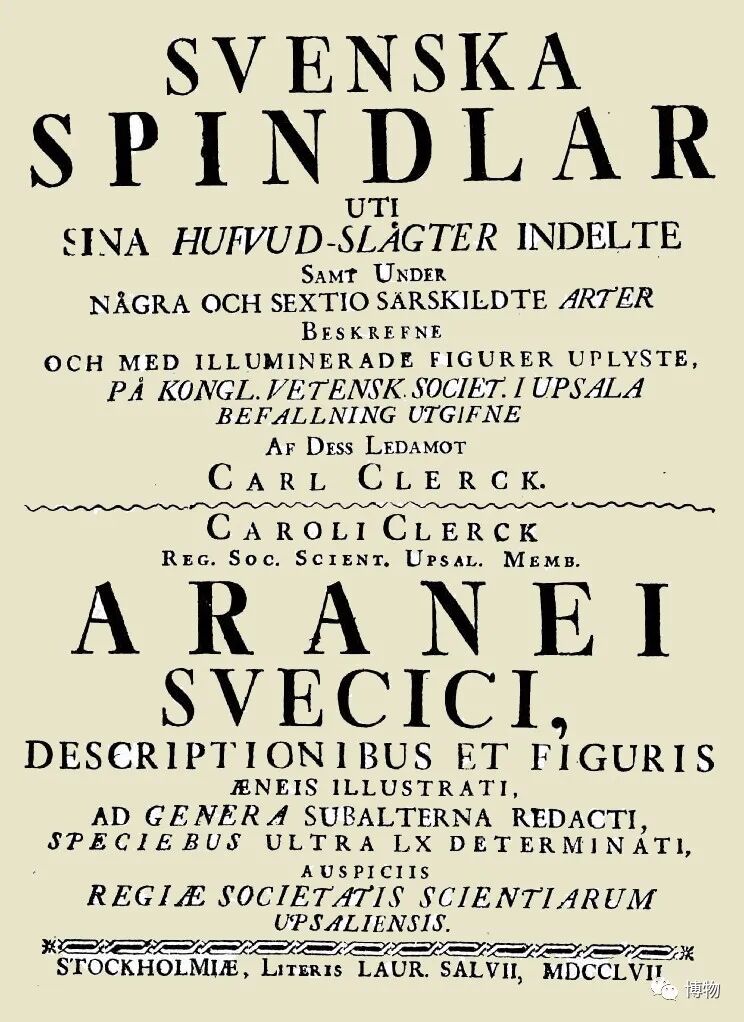 研究蜘蛛,当然也不例外。最早的蜘蛛分类学文献,是1757年瑞典蛛形学家(研究蜘蛛和其他蛛形纲动物)克勒克于所著的《瑞典蜘蛛》,它比生物分类学“开山经典”、林奈大师的《自然系统》还早一年。
