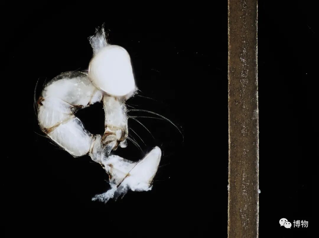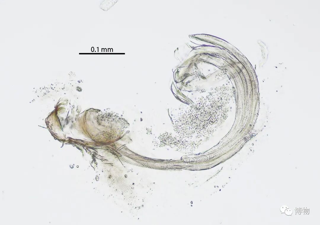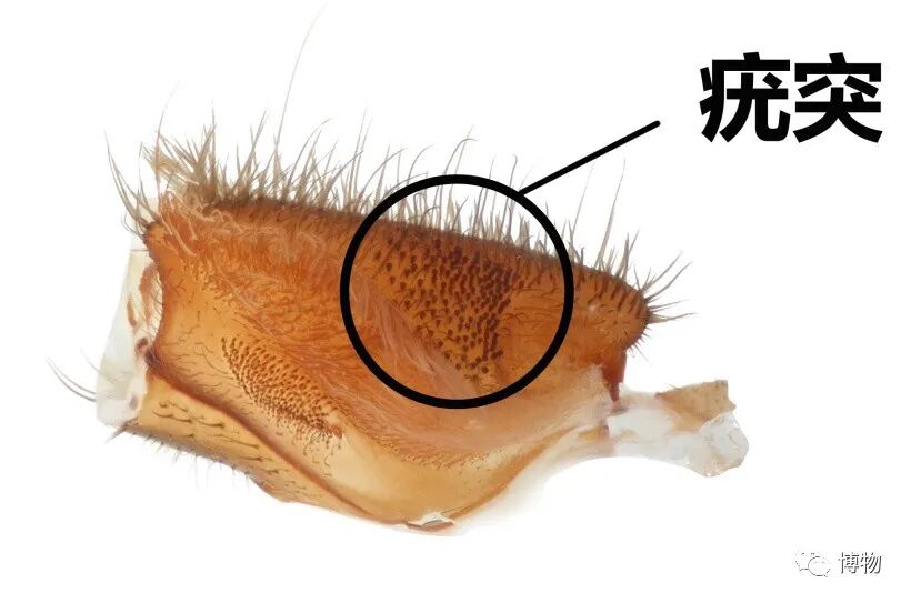 这是蜘蛛的一片颚叶,颚叶长在嘴边,可以与“大牙”一起撕碎昆虫。鉴定时,要数清上颚叶上有多少个细小的疣突,数到人崩溃。