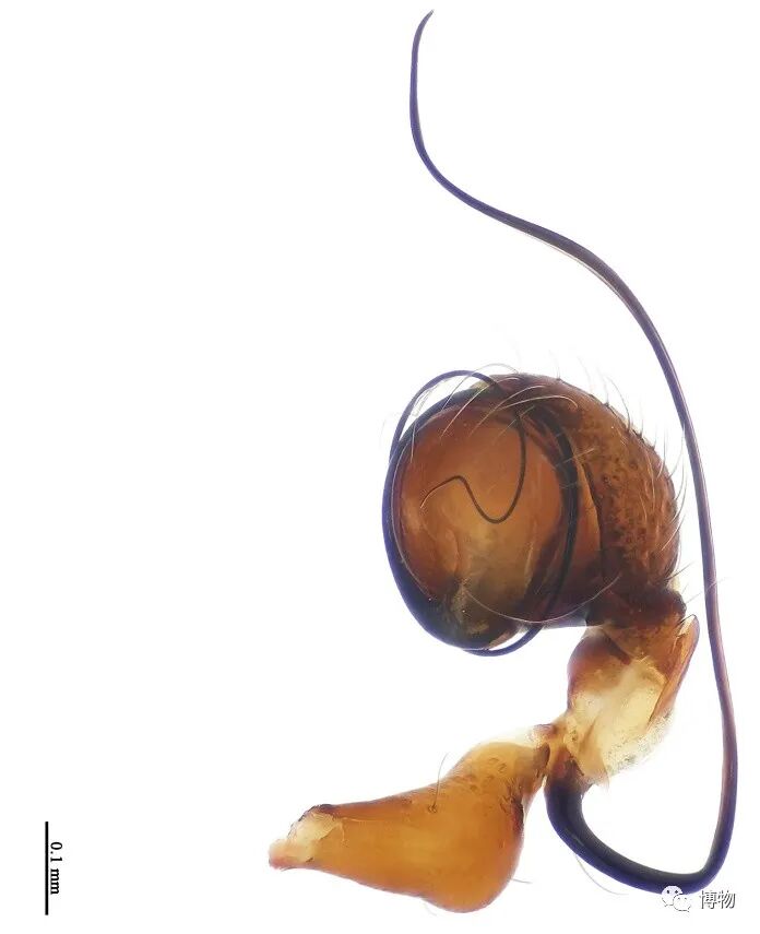 解剖后取下的雄性蜘蛛生殖器标本,图中比例尺为0.1毫米