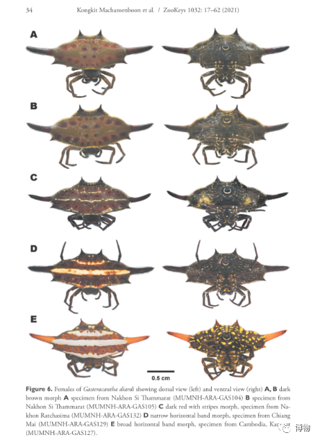 在一篇研究蜘蛛的学术论文中,展示了5种花纹差异很大的蜘蛛,但它们其实都是同一种,叫地阿棘腹蛛,分布在我国南部和东南亚几家。蜘蛛鉴定不靠外观花色,主要靠生殖器官,其次是眼距、腿“毛”数等各种详细的身体数据。