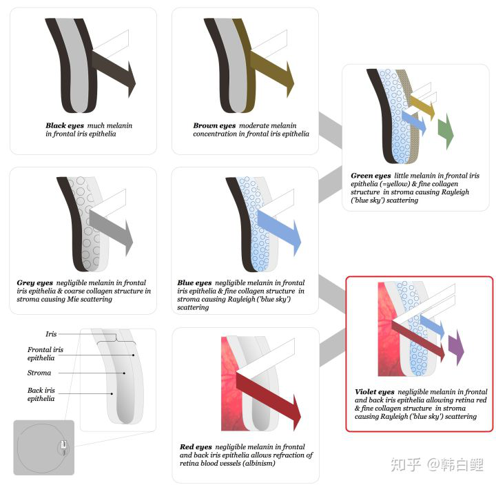 图源知乎@韩白鲤世界上大多数人其实都是棕色虹膜,为什么欧洲人却能拥有让人想忍不住沉溺的蓝色和绿色眼睛呢?这归功于瑞利散射,事实上散射的光强度和散射频率的四次方成正比。波长较短的蓝光比红光更容易产生瑞利散射。这时候,蓝光就会随之散开,覆盖基质层,让眼睛看起来是蓝色的。所以人的眼睛颜色,从本质看就是一种光学现象的衍生。