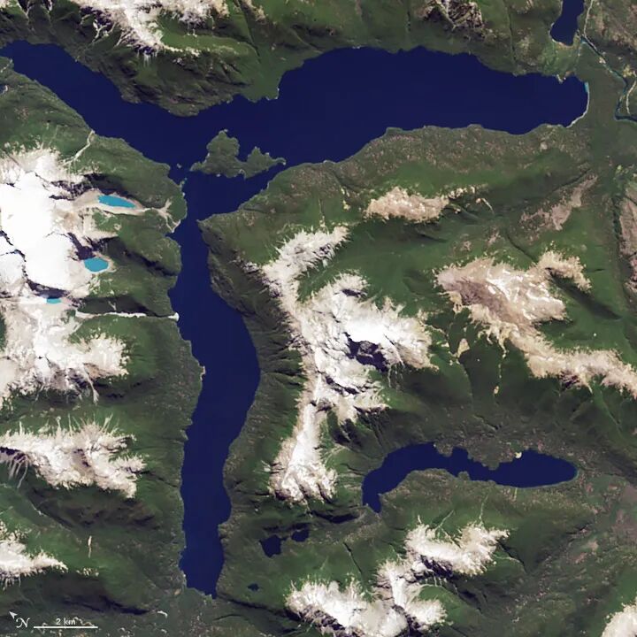 “R”,小写的,这是Landsat 8于2015年1月20日拍摄的位于阿根廷的Menéndez湖。