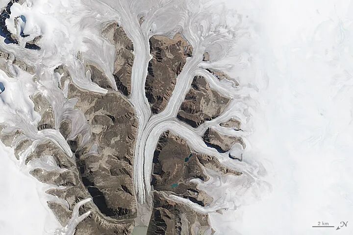 “X”并非是日常生活中容易见到的——我们常常看见三个自然图形共顶点,但四个自然图形共顶点形成X形,就需要一些特殊的环境。如图是格林兰的Leidy冰川的一个局部,纵横交错的冰川剥蚀在这里形成了一个X。由Terra卫星的ASTER仪器拍摄于2012年8月7日。
