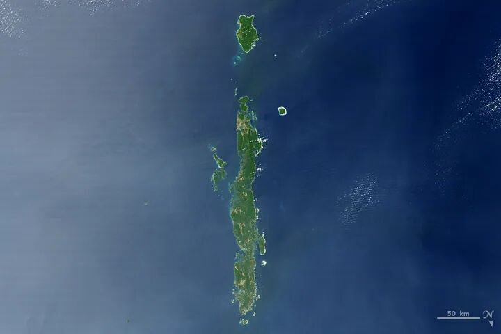 I 这个字母,同样,不能说是全无关系,只能说是完全一致。这笔挺笔挺的竖,这微斜粗糙的小点,完全就是一个小写的“i”,甚至都有点手写体的意思了。这张图片由NASA的Terra卫星拍摄于2007年2月10日,图中的岛屿是安达曼群岛的一部分,图中有一些岛屿周边环绕着亮白色的环,那是2004年一次大地震中,珊瑚礁被抬升起来造成的。