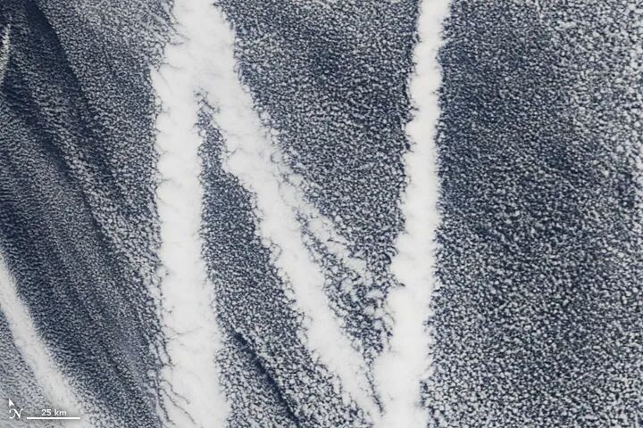 “N”的形状,这张照片里勾勒得比我手写得还好。这是2009年3月4日,Terra卫星拍摄的太平洋表面的轮船的航迹——也就无怪乎如此地横平竖直了。