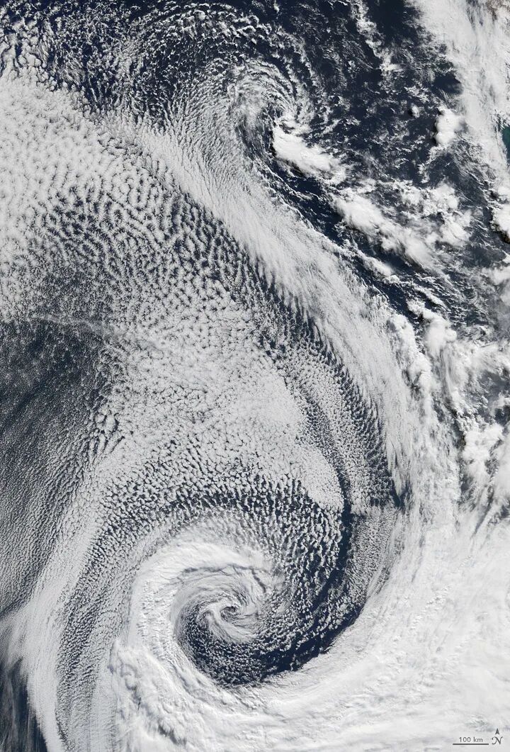“S”,就是两股云在大西洋的上空打起了卷儿~照片由Terra卫星摄于2009年4月29日。
