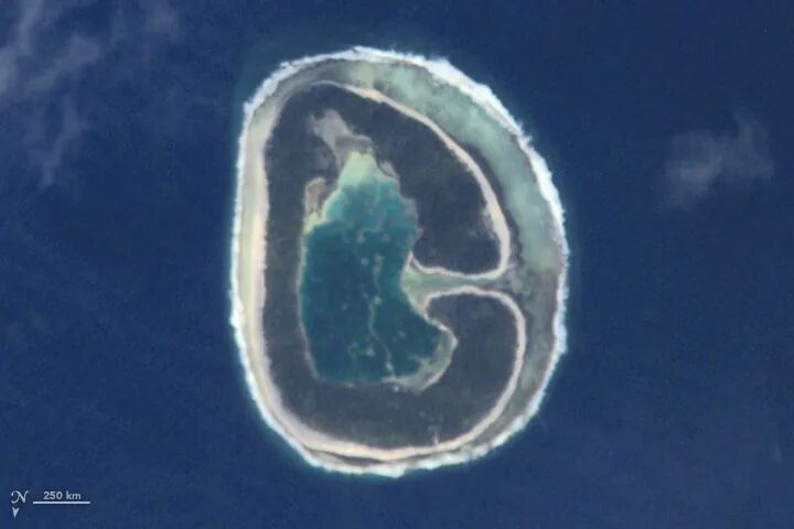 这是个腰子?不,这是G。这张图片记录的是皮纳基环礁(Pinaki Island),是南太平洋法属波利尼西亚的环礁,属于土阿莫土群岛的一部分。这张图片最初由国际空间站上的宇航员,在2001年4月拍摄,经过放大处理,北方向下。