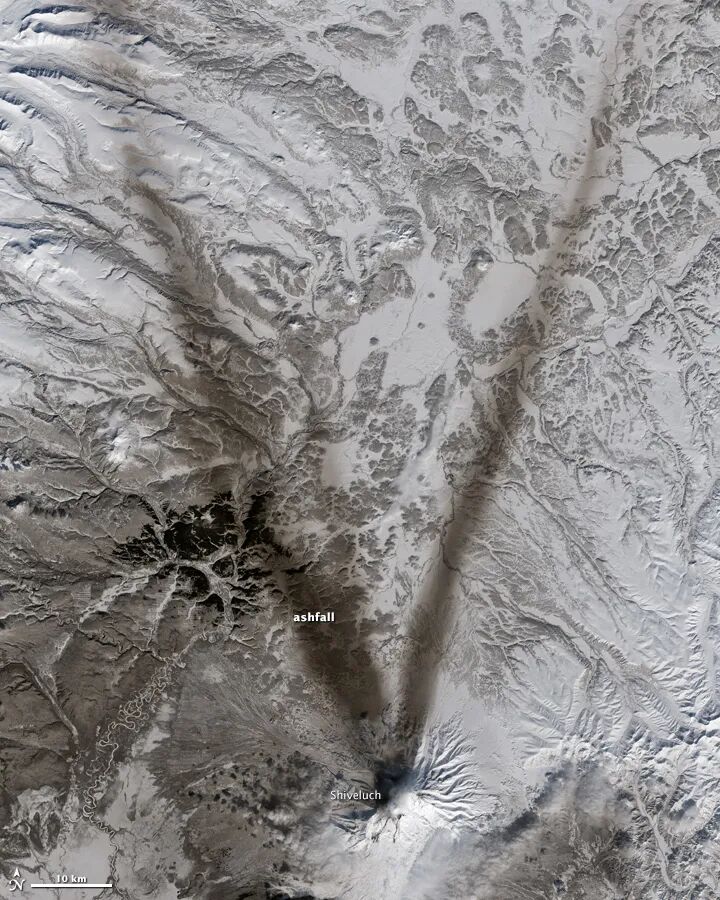 “V”字带有尖锐的角,通常来说在自然界不太常见。但是,两阵不同方向的风,和一座活跃的火山,兴许就可以构建这个图象。图中是俄罗斯勘察加半岛上的舍维留奇火山喷发中,火山灰的散布。由于风向的改变,火山灰在雪地上画出了两条界限分明,又非常笔直的印记。这张图由Landsat 8拍摄于2015年3月23日。