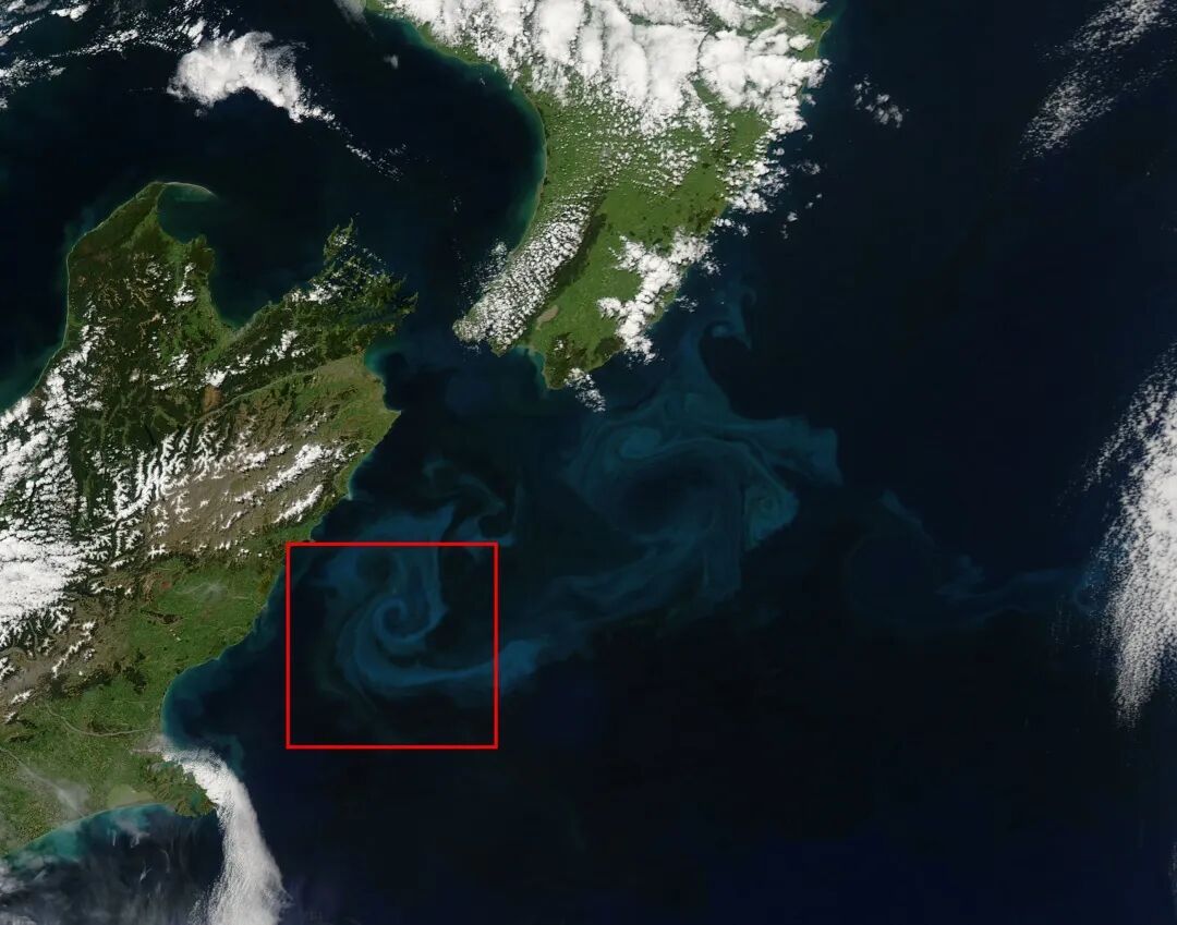 字母E的情况稍微有些复杂——你需要一个不是很闭合也不是很完整的漩涡来实现这个形状:“e”。不过,还是被找到了。这张图由NASA的Aqua卫星(即“水”卫星)拍摄,记录的是2009年10月25日,新西兰附近海域的浮游生物的一次大繁荣。当时正值南半球的春天,海洋水温上升,浮游藻类大量增殖。