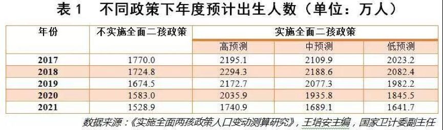 根据国家统计局的数字,全面二胎政策实施的第二年——2017年中国出生人口与生育率分别为 1723 万人和 12.43‰,双双下跌,出生人口远低于国家卫计委的预测数值(参见表1)。