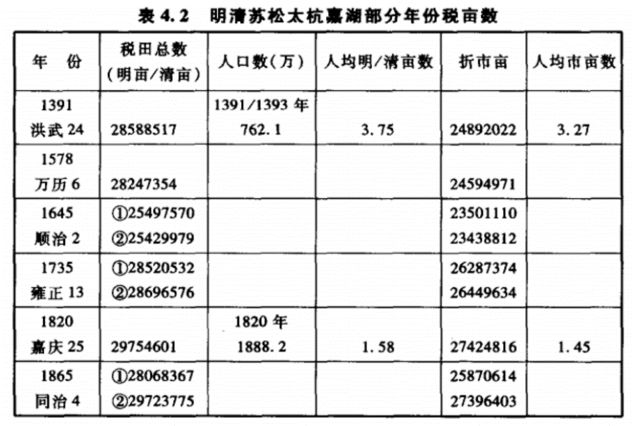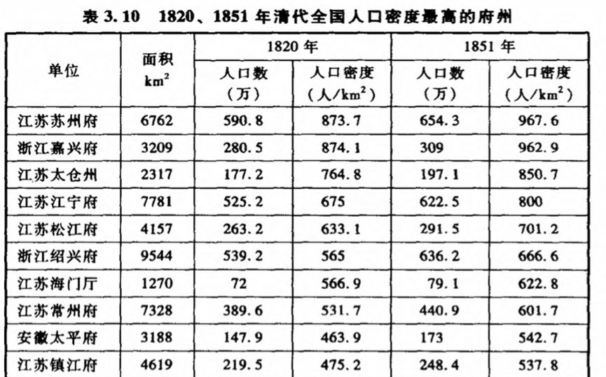 清代乾隆四十一年(1776 年),上述的江南十府一州的人口总数约为 3095.1 万,到嘉庆二十五年(1820 年)人口数约 3797.3 万,44 年间人口增幅 23%,年均增长率为 4.66%。